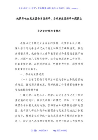 / 统战部长在某某县委常委班子、县政府党组班子专题民主生活会对照检查材料