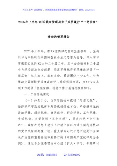 / 2025年上半年XX区城市管理局班子成员履行“一岗双责”责任的情况报告