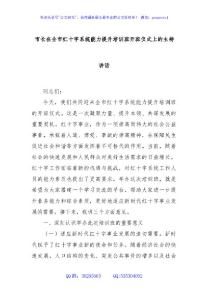 / 市长在全市红十字系统能力提升培训班开班仪式上的主持讲话