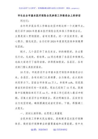 / 市长在全市基本医疗保险全民参保工作推进会上的讲话