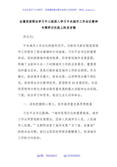/ 在镇党委理论学习中心组深入学习中央城市工作会议精神专题研讨交流上的发言稿