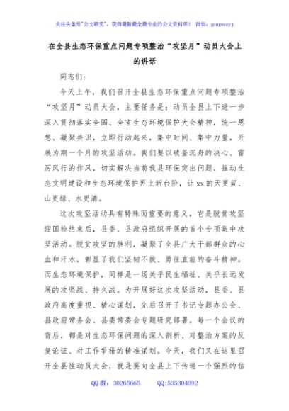 / 在全县生态环保重点问题专项整治“攻坚月”动员大会上的讲话