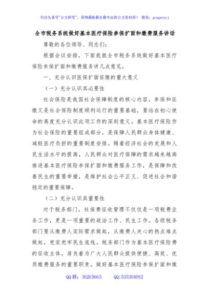 / 全市税务系统做好基本医疗保险参保扩面和缴费服务讲话
