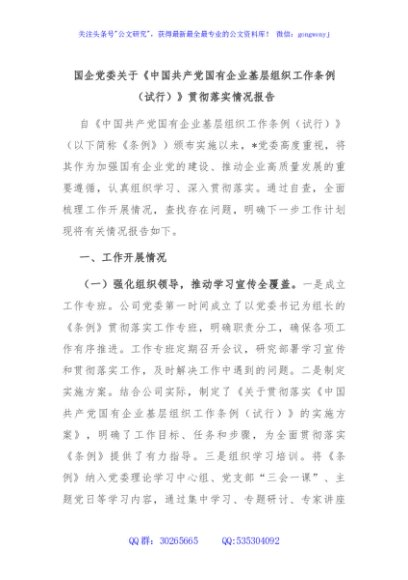/ 国企党委关于《中国共产党国有企业基层组织工作条例(试行)》贯彻落实情况报告