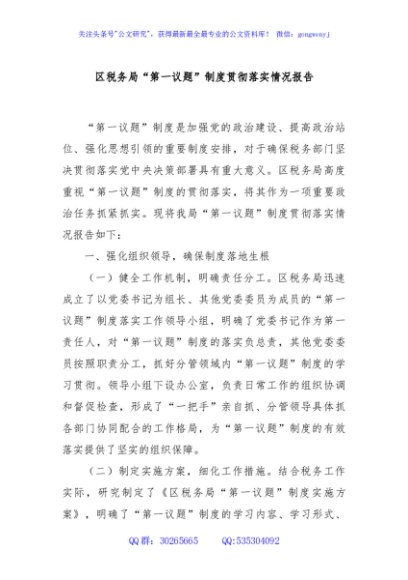 / 区税务局“第一议题”制度贯彻落实情况报告