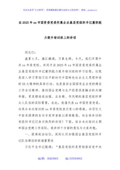 / 在2025年xx市国资委党委所属企业基层党组织书记履职能力提升培训班上的讲话
