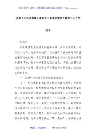 / 县委书记在县委理论学习中心组作风建设专题学习会上的发言