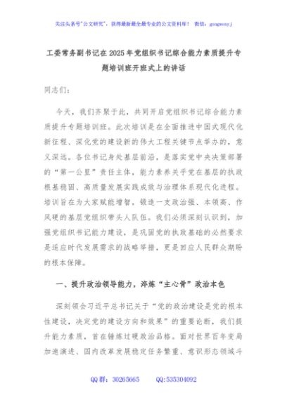 / 工委常务副书记在2025年党组织书记综合能力素质提升专题培训班开班式上的讲话