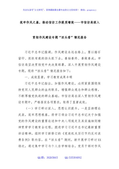/ 筑牢作风之基,推动信访工作提质增效——市信访局深入贯彻作风建设专题“回头看”情况报告
