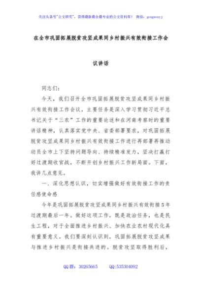 / 在全市巩固拓展脱贫攻坚成果同乡村振兴有效衔接工作会议讲话
