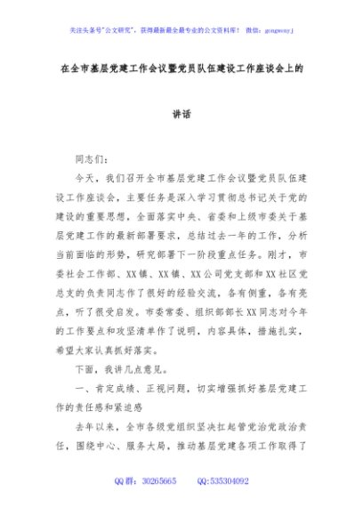 / 在全市基层党建工作会议暨党员队伍建设工作座谈会上的讲话