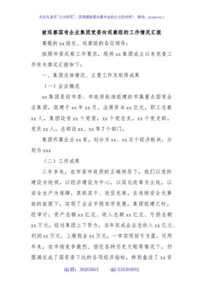 / 被巡察国有企业集团党委向巡察组的工作情况汇报