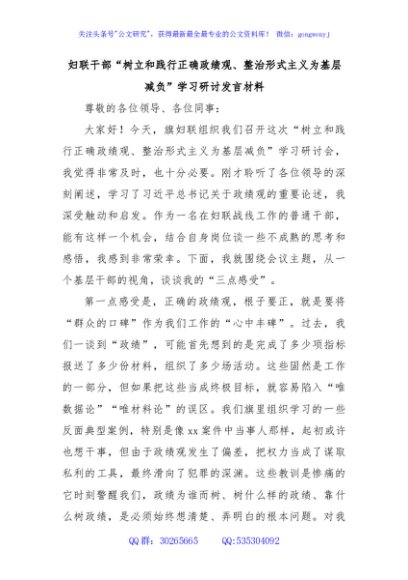 妇联干部“树立和践行正确政绩观、整治形式主义为基层减负”学习研讨发言材料