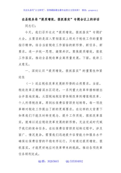 / 在县税务局“提质增效,狠抓落实”专题会议上的讲话