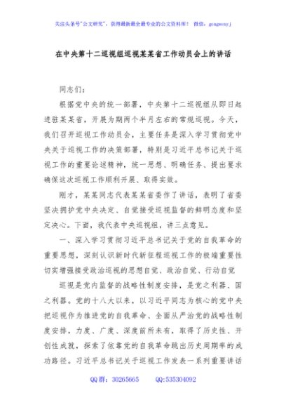 / 在中央第十二巡视组巡视某某省工作动员会上的讲话