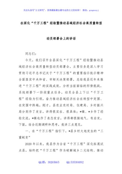 / 在深化“千万工程”经验暨推动县域经济社会高质量转型动员部署会上的讲话