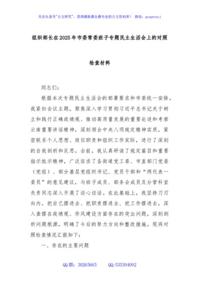 / 组织部长在2025年市委常委班子专题民主生活会上的对照检查材料