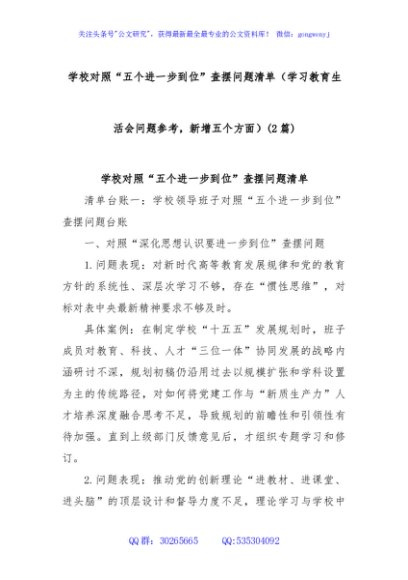 / (2篇)学校对照“五个进一步到位”查摆问题清单(学习教育生活会问题参考,新增五个方面)