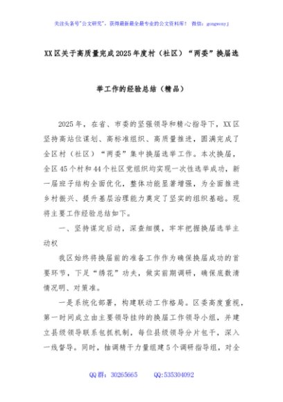 / XX区关于高质量完成2025年度村(社区)“两委”换届选举工作的经验总结(精品)