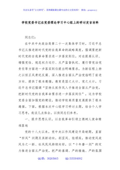 / 学校党委书记在党委理论学习中心组上的研讨发言材料
