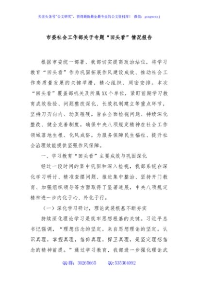 / 市委社会工作部关于专题“回头看”情况报告