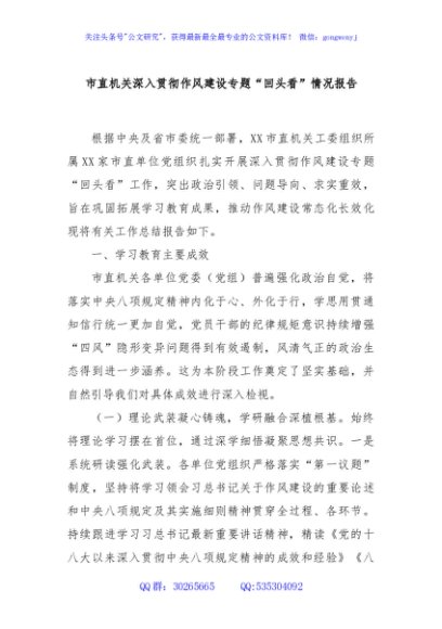 / 市直机关深入贯彻作风建设专题“回头看”情况报告