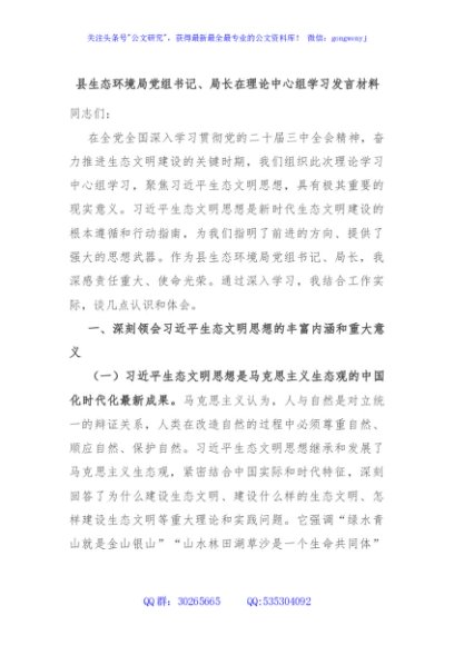 / 县生态环境局党组书记、局长在理论中心组学习发言材料
