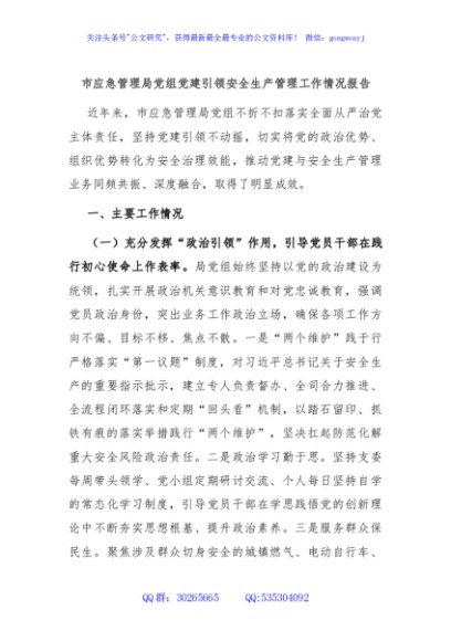 / 市应急管理局党组党建引领安全生产管理工作情况报告