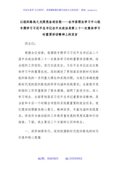 / 以组织路线之光照亮奋进征程——在市委理论学习中心组专题学习总书记在中央政治局第二十一次集体学习时重要讲话精神上的发言