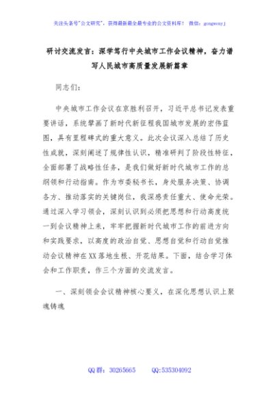 / 研讨交流发言:深学笃行中央城市工作会议精神,奋力谱写人民城市高质量发展新篇章