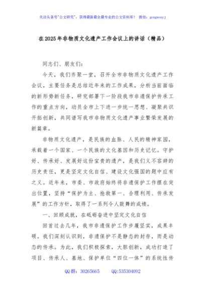 / 在2025年非物质文化遗产工作会议上的讲话(精品)