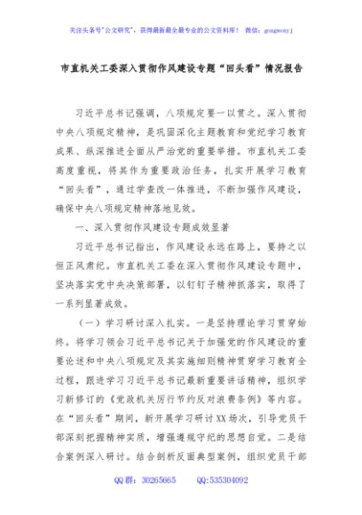 / 市直机关工委深入贯彻作风建设专题“回头看”情况报告