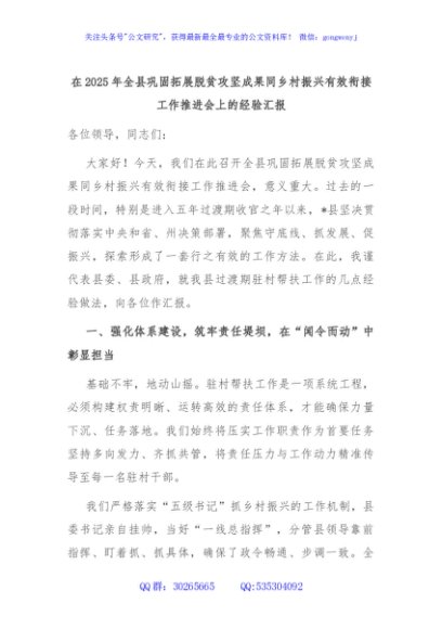 / 在2025年全县巩固拓展脱贫攻坚成果同乡村振兴有效衔接工作推进会上的经验汇报