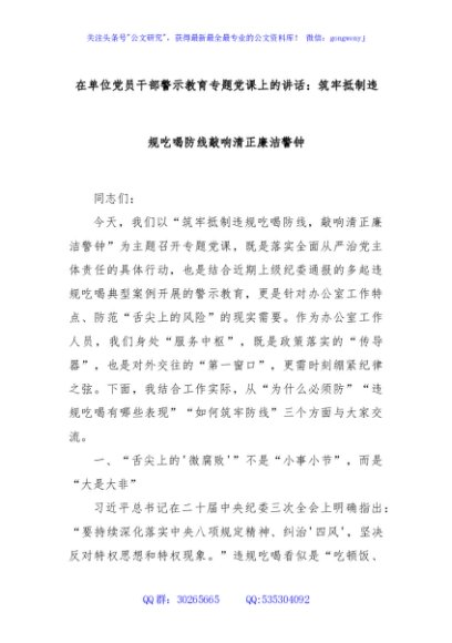 / 在单位党员干部警示教育专题党课上的讲话:筑牢抵制违规吃喝防线敲响清正廉洁警钟