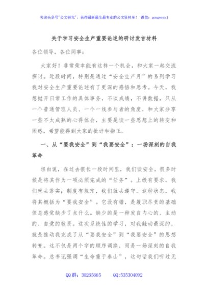 / 关于学习安全生产重要论述的研讨发言材料