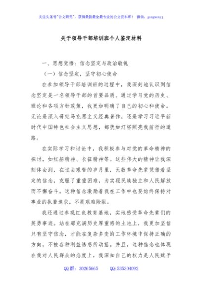 关于领导干部培训班个人鉴定材料