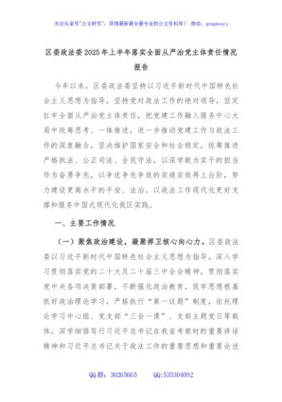 / 区委政法委2025年上半年落实全面从严治党主体责任情况报告