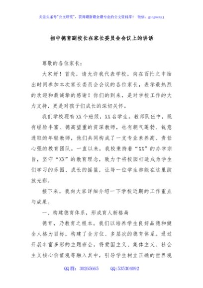 / 初中德育副校长在家长委员会会议上的讲话
