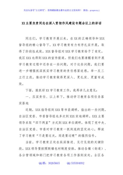 / XX主要负责同志在深入贯彻作风建设专题会议上的讲话
