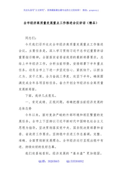 / 全市经济高质量发展重点工作推进会议讲话(精品)