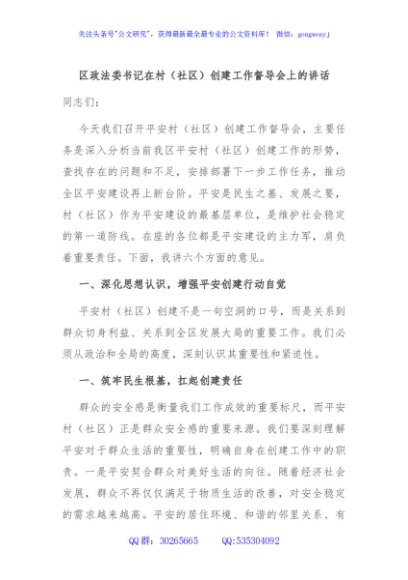 / 区政法委书记在村(社区)创建工作督导会上的讲话
