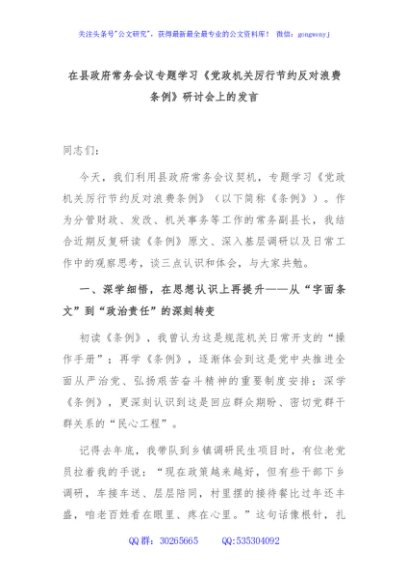/ 在县政府常务会议专题学习《党政机关厉行节约反对浪费条例》研讨会上的发言