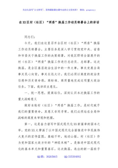 / 在XX区村(社区)“两委”换届工作动员部署会上的讲话