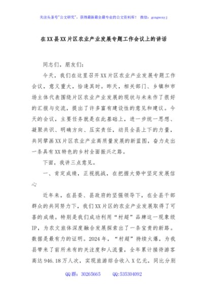 / 在XX县XX片区农业产业发展专题工作会议上的讲话