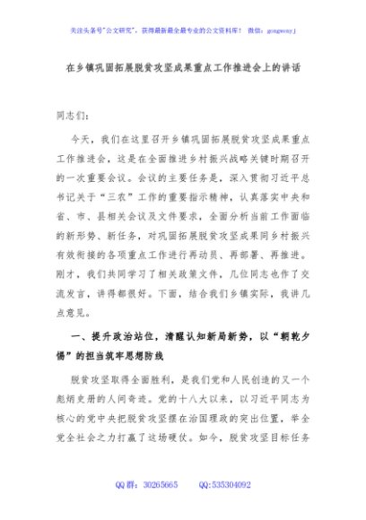 / 在乡镇巩固拓展脱贫攻坚成果重点工作推进会上的讲话