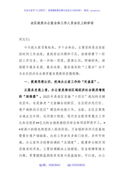/ 在区政府办公室全体工作人员会议上的讲话