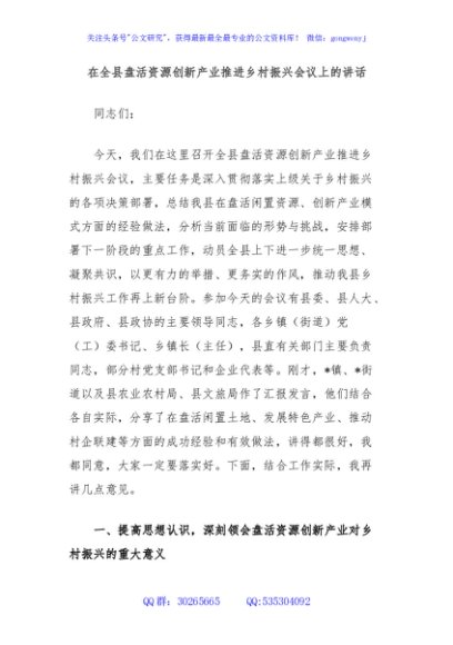 / 在全县盘活资源创新产业推进乡村振兴会议上的讲话