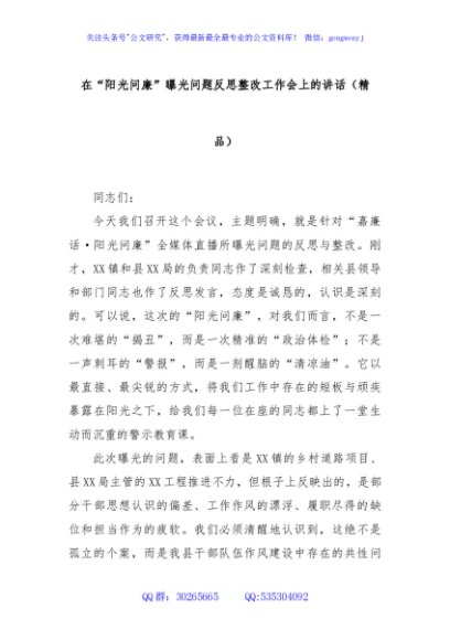 在“阳光问廉”曝光问题反思整改工作会上的讲话(精品)