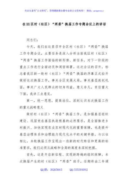 / 在XX区村(社区)“两委”换届工作专题会议上的讲话