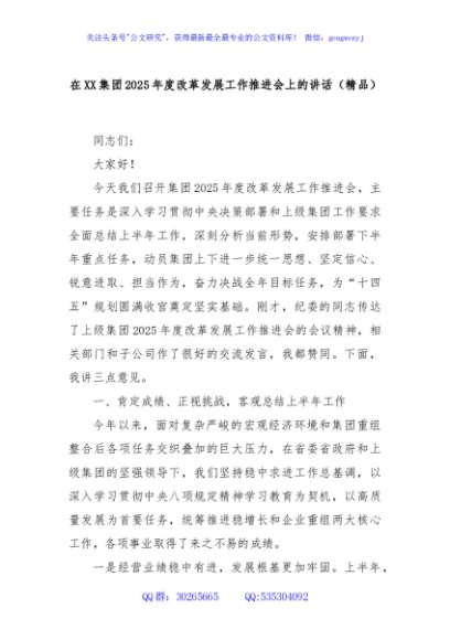/ 在XX集团2025年度改革发展工作推进会上的讲话(精品)
